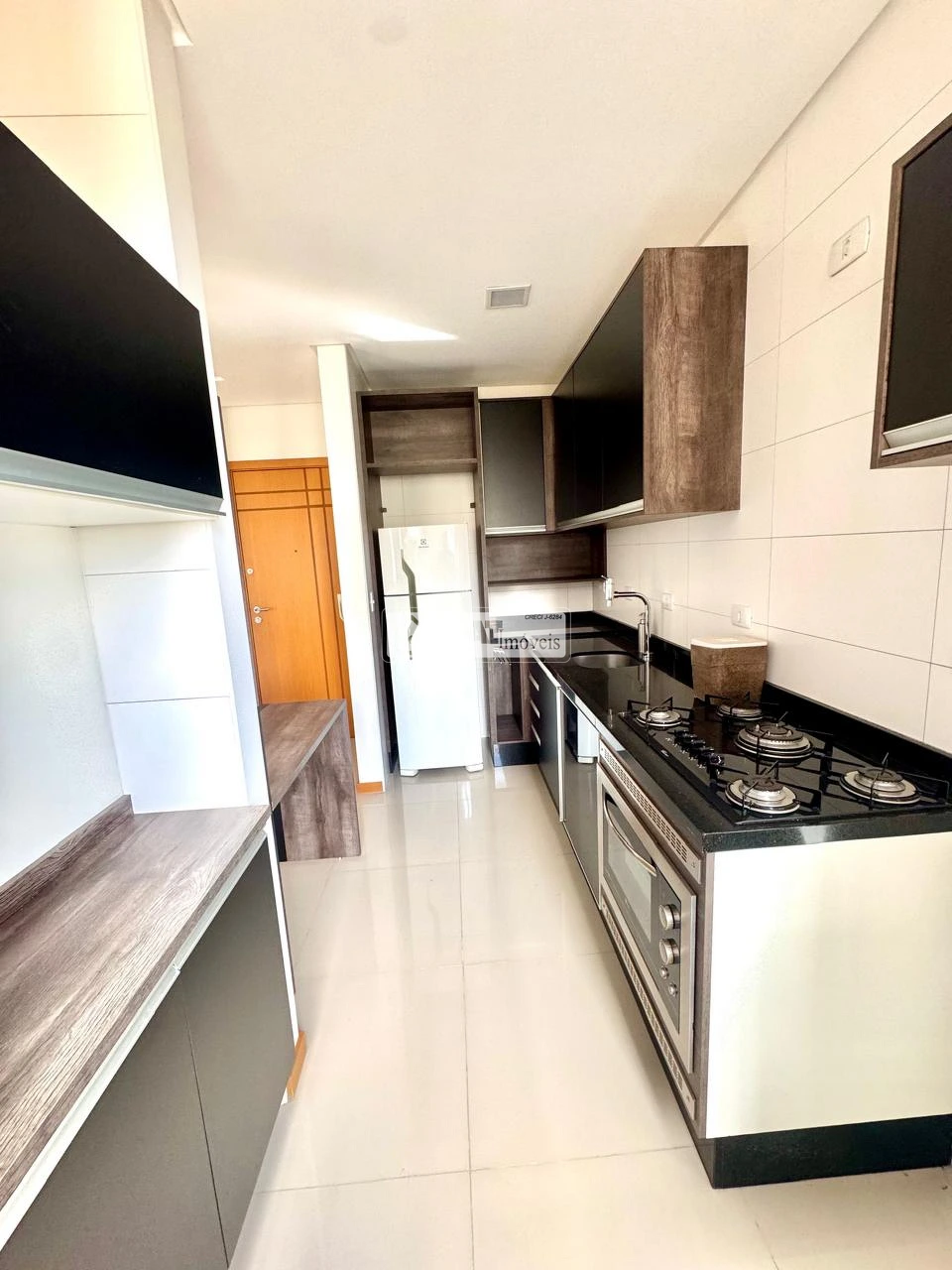 Cozinha com cooktop e forno, geladeira;