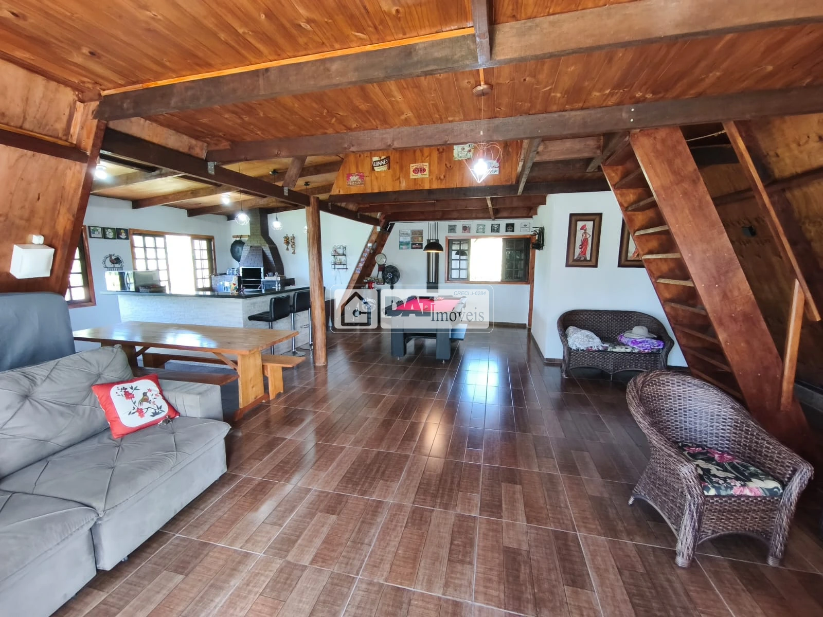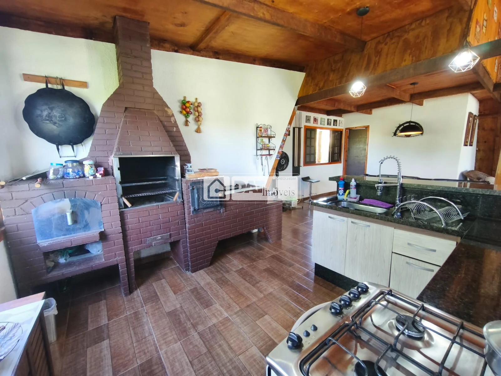 parte de baixo sala ampla com lareira e mesa de sinuca, cozinha, fogão a lenha, churrasqueira dentro, forno de pizza, 1 banheiro.